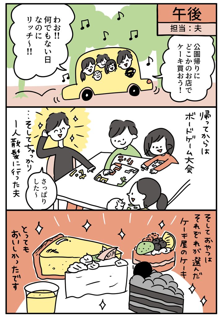 次の時間の担当は夫です。昨日から自分の時間の使い道をうんうん考えていた夫。まずは「帰りがけにケーキ屋さんで好きなケーキを1人1つ買っておやつにしよう!」とのことでケーキ屋に向かいました。