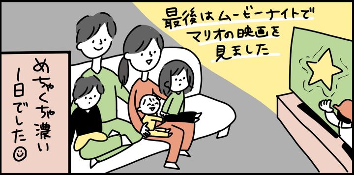 何をしようかなと悩んでいたら、息子が「映画館にしようよ!」とアイデアを出してくれ、おうち映画館をすることにしました。部屋を暗くして、ソファに並んで座ってみんなで「ザ・スーパーマリオブラザーズ・ムービー」を観ました。
