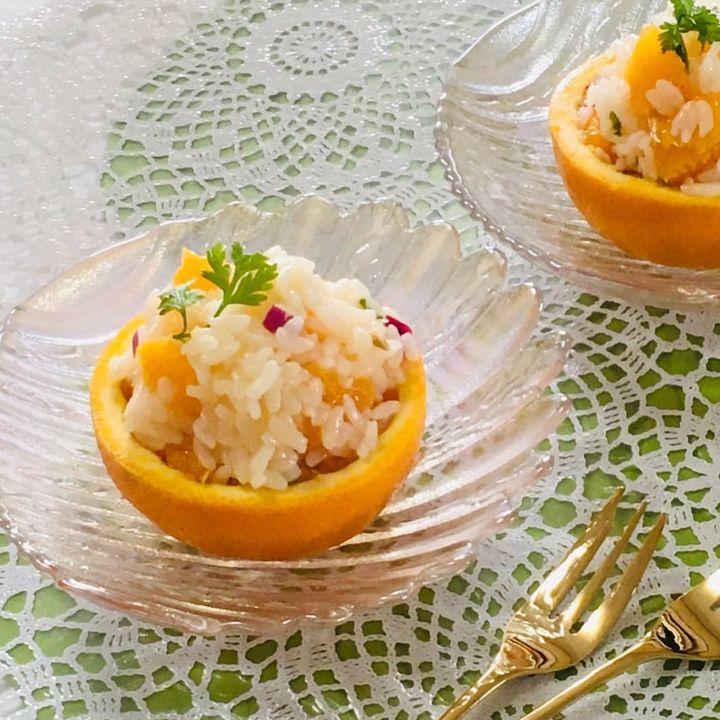 オレンジの皮を器に使った、見た目も香りもさわやかなカップ寿司。生ハムの塩味がアクセントとなって、おいしさを引き立てます。