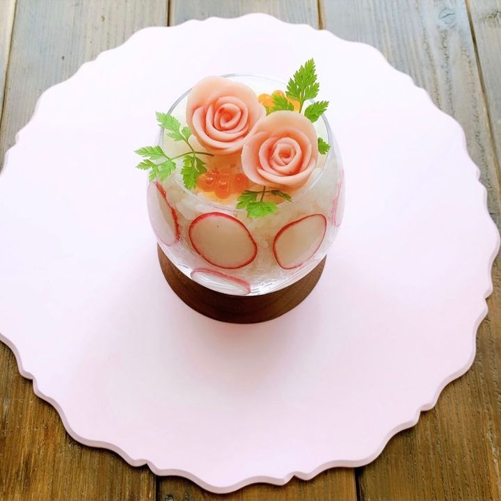 透明なガラス越しに見える断面がとてもきれいで、ハレの日はもちろん、おもてなしごはんにも。