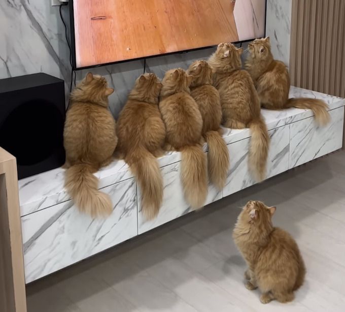 テレビに夢中! 最前列でお行儀よく並ぶ猫ちゃんたちが可愛すぎる♡