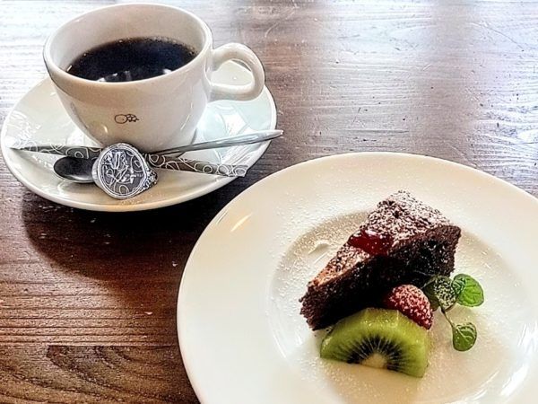 ★選べるデザート ガトーショコラと自家焙煎コーヒー しっとり硬めな手作りガトーショコラは甘さ控えめ、ナッツも入っていてザクザクと美味しい〜。 自家焙煎コーヒーも深い味わいで、ガトーショコラにぴったり。