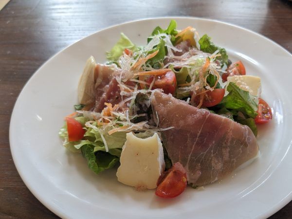 ★おまかせサラダ す、すご〜いボリューム! シャキシャキしたフレッシュサラダ、何枚もの大きな生ハム、カットチーズがたっぷり。こんなに贅沢なサラダ、一皿目から幸せ〜♪