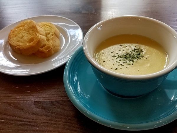 ★本日のスープとパン あらごしでとろ〜り、自然な甘みの優しいスープ。カリカリの甘いフランスパンをスープにつけると、これまた美味。