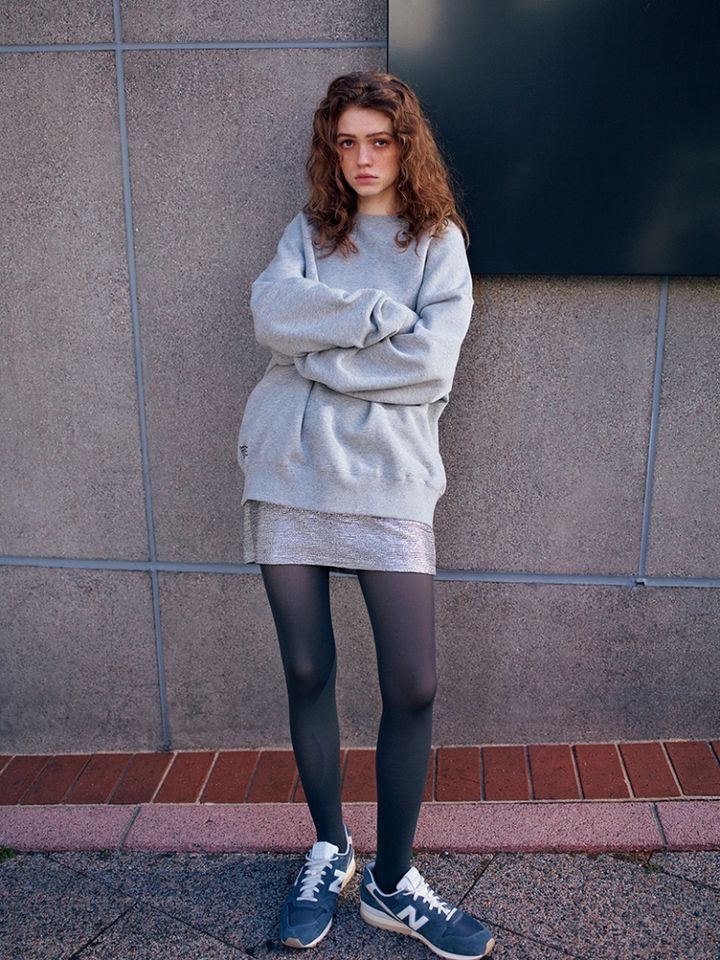 グレーにツヤをまとったようなシルバーは、意外と手持ちの服になじみやすい色。アクセサリーのようなきらめきで、カジュアルな服装のあどけなさを打ち消す役割が。タイツでつなげたスニーカーで、キャッチーなミニスカートを日常に引き戻す役割も。