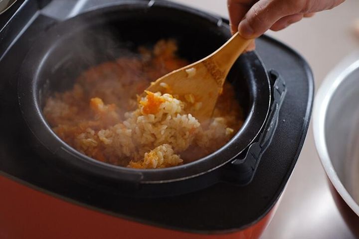 炊飯器に入れて3合の目盛りまで水を入れ、にんじんと油を加えて炊く。