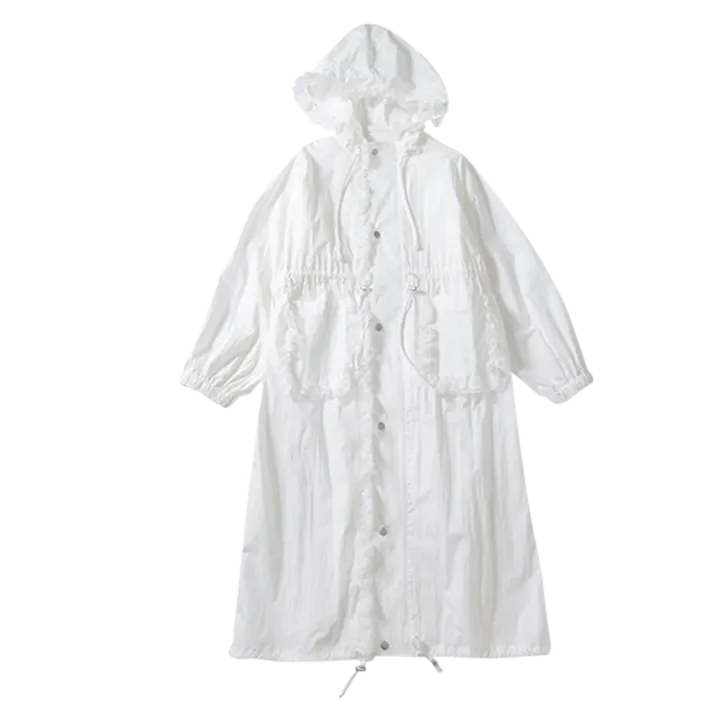 フードやポケットのフリルデザインが女の子らしい♡ 春アウターは爽やかな白で、まわりの視線を集めて。