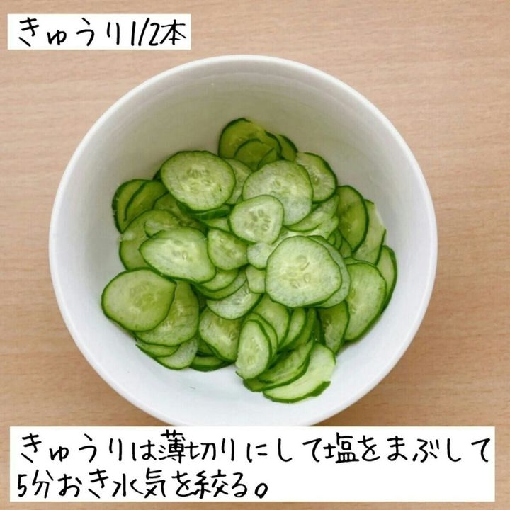 きゅうりは薄切りにして塩(分量外・少々)をまぶして5分ほどおき、水気を絞る。