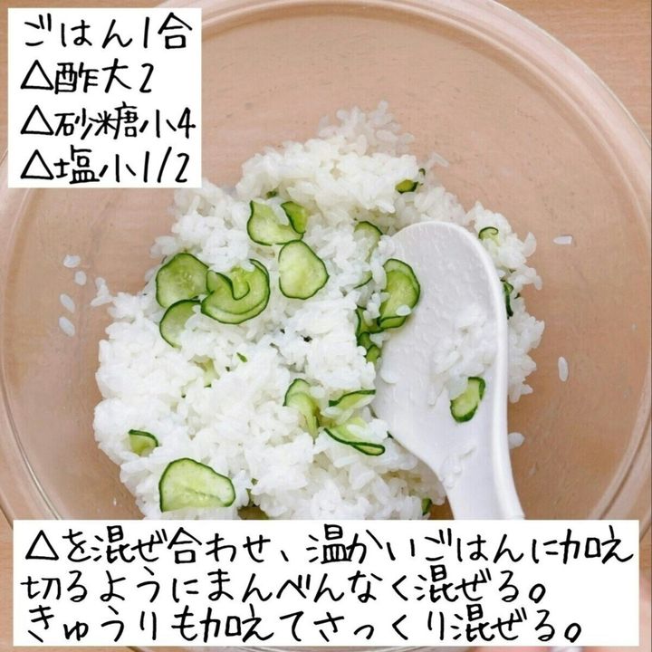 △を合わせる。温かいごはんに△を加え切るようにまんべんなく混ぜ、きゅうりと白ごまを加えてさっくり混ぜる。