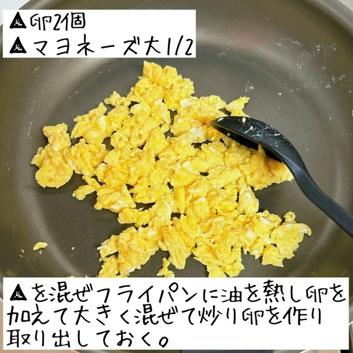▲を混ぜ、フライパンにサラダ油を熱して卵を加え、大きく混ぜて炒り卵を作り取り出しておく。