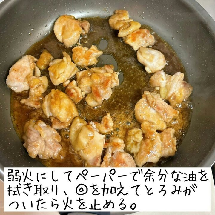弱火にしてペーパーで余分な油を拭き取り、◎を加えて炒めとろみがついたら火を止める。