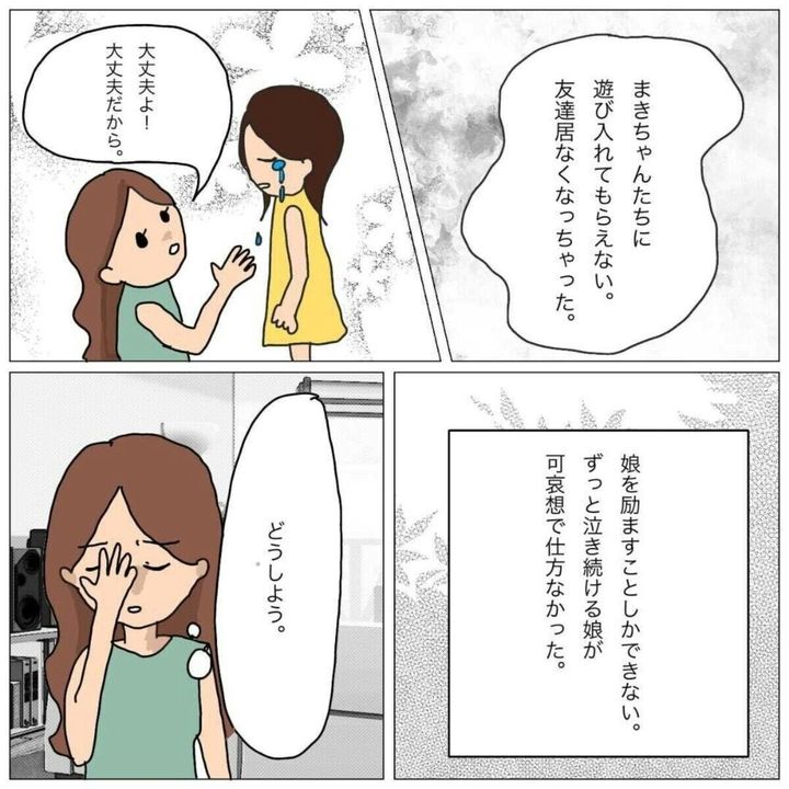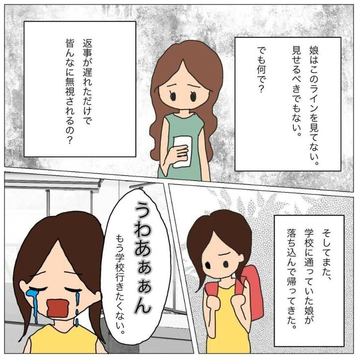先生からの注意があった後ですが、どうやらりさちゃんを外して別のグループに移動したようです。さらにスマホの中だけでなく、現実でも仲間外れにされて泣きながら「もう学校行きたくない」と言い出すりさちゃん。