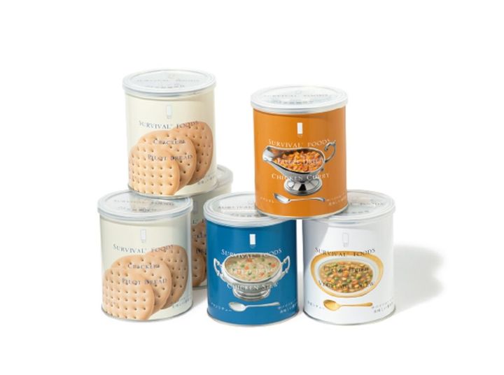チキンカレーとチキンシチュー、野菜シチュー、クラッカーのセット。お湯を注ぐと5分、水でも10分で本格的な料理が出来上がる。缶切り付き。15食相当¥19,764(サバイバル(R)フーズ/防災のセレクトショップSEISHOP TEL:0120・108・565)