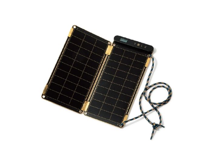 USBケーブルのアイテムに使える、太陽光パネルを搭載した薄くて軽いポータブル充電器。生活防水対応で、雨や雪の日でも使える。折りたたみ時W9×D19×H1.1cm。¥18,700(YOLK/ELEMINIST SHOP )