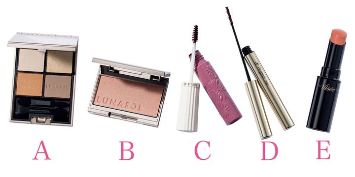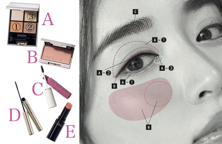 A1をアイホールよりやや狭めにのせ、締め色の2をキワにライン状にのせる。下まぶたも全体に1のオレンジをのせ、目頭には3で輝きを。チークはツヤ感のあるBを広く入れて、求心的になるように鼻側にもう一度重ねづけ。リップもEでベージュ系のツヤを。全体がシアーな分、眉とまつ毛にピンクをのせ、甘さをプラス。Dのカシスピンクを上まつ毛の内側と外側にも塗る。下まつ毛にはのせない。眉もCでピンクに染める。