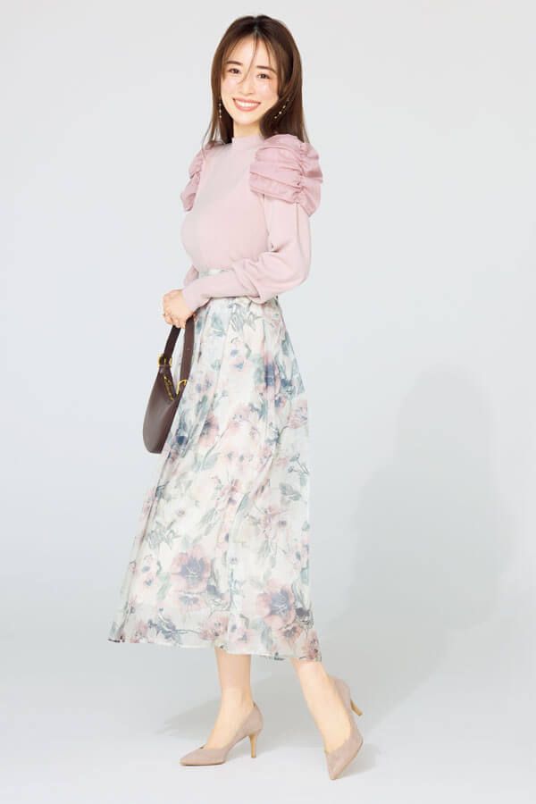ピンクや花柄のフェミニンなコーデは、メイクまでピンク系で甘くしてしまうとトゥーマッチなので引き算を意識するのがポイント。