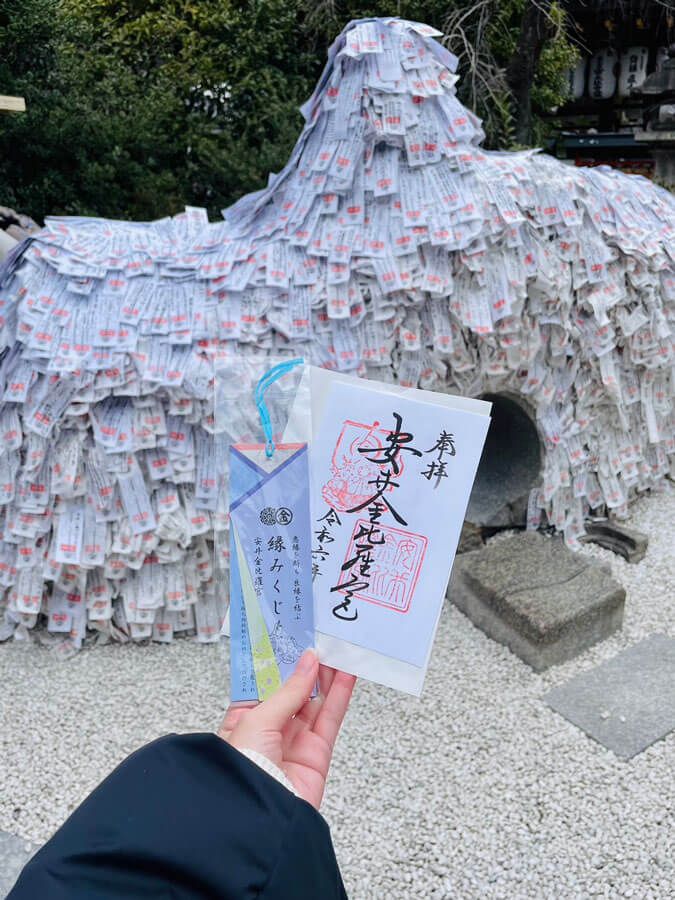 碑の穴は思ったより狭くて、くぐるのに少し緊張しました。その後は縁みくじを引いて、御朱印もゲットしました! 良いことがありますように♪