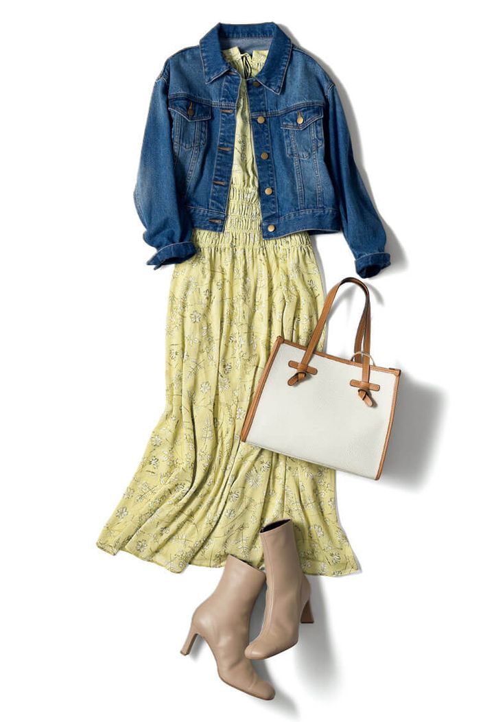 キャンバストートのような感覚で、カジュアルに持てるのもこのバッグの魅力。花柄ワンピの甘さをGジャンで中和する王道のフェミカジュを、もうひと押しこなれさせるキーアイテムに。