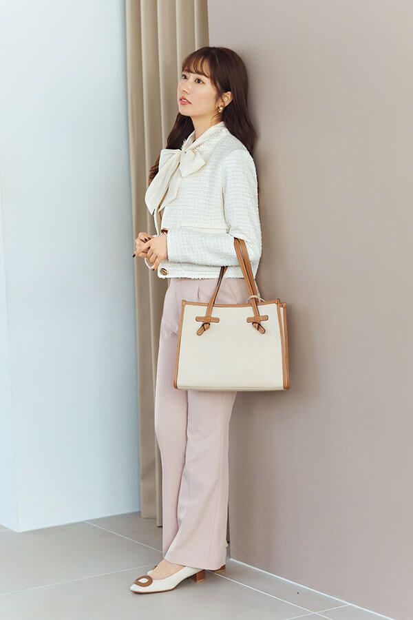淡い色みでまとめたジャケットスタイルの軽やかさを、ナチュラルカラーのバッグでも後押し。バッグと靴のカラーを合わせて、コーデの統一感アップ。