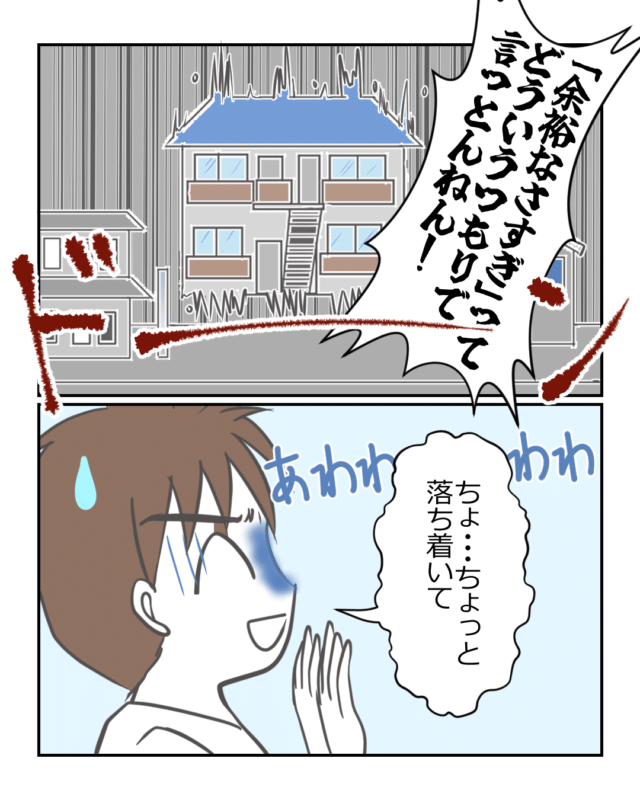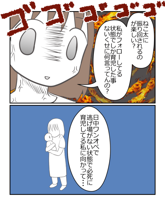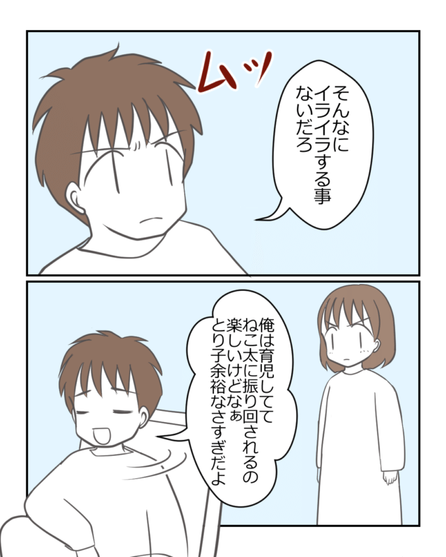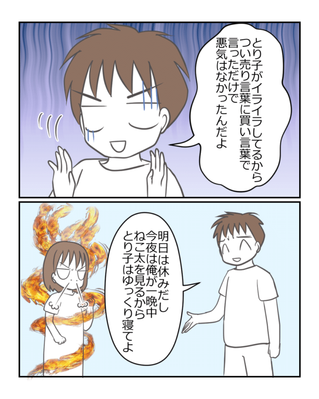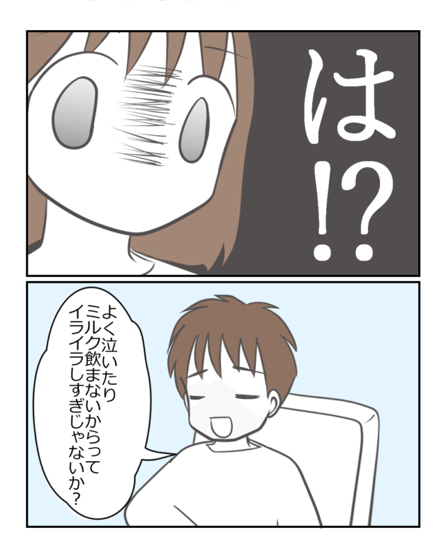 環境を整えタイミングを見計らい神経を尖らせて授乳しても飲んでくれないねこ太くんに苛立ちを覚え、哺乳瓶を投げつけねこ太くんに怒鳴ってしまったとり子さん。泣き出したねこ太くんにハッとして我に返ったとり子さんは自己嫌悪で涙します。その夜、寝室で授乳していると隣の部屋からご主人の観ているテレビの大きな音が聞こえてきて「授乳中は静かにしてって言ったでしょ!何でそんなに無神経なのよ!」とご主人の行動に怒りが爆発・・・。