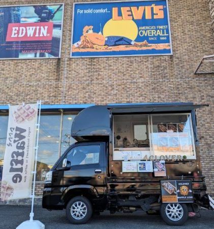 キッチンカーのワッフル屋さん、4CLOVERです。福島市のアメリカ屋福島矢野目店様の駐車場にて販売中におじゃましました。オシャレなブラックカラーのキッチンカーです‼
