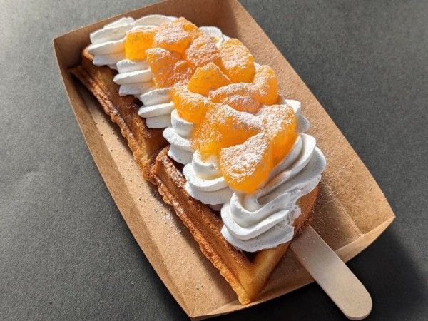 真っ赤なイチゴが乗ったクリームワッフルとどちらにしようか悩みましたが、みかんをチョイス‼爽やかなみかんの風味と主張しすぎない生クリームがワッフルの食感と相まってトリプルで攻めてきました。もう降参です、美味し過ぎます‼どうせ降参するなら、こんなに美味しいならイチゴも買えばよかったと後悔…(笑)