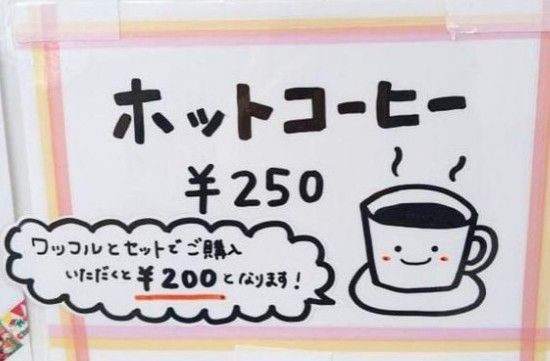 ホットコーヒーの販売もあるので買って直ぐ食べるのもよさそうですよ~ワッフルとセットで50円OFF‼お得ですね~