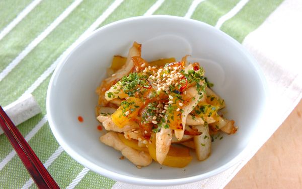 ちくわとたくあん、鶏ささ身で食感の良いきんぴらを作りましょう。鶏ささ身から先に炒め、ちくわとたくあんが温まったら、調味料を加えます。赤唐辛子でピリ辛にすることで、全体が引き締まりますよ。