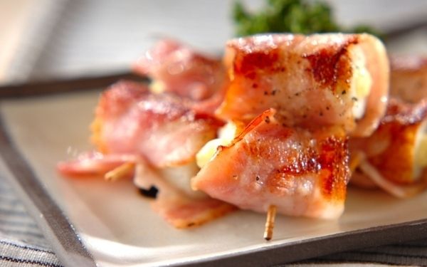 チーズを詰めたちくわをベーコンでくるりと巻く、簡単おかず。ベーコンとちくわの旨みが口いっぱいに広がります。冷めても味が落ちず、おつまみやお弁当に喜ばれますよ。