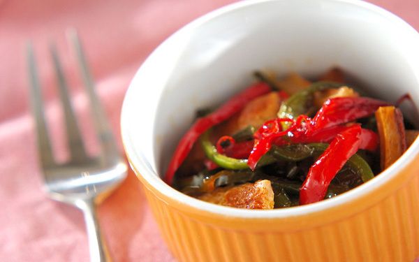 ピーマンとちくわだけでは彩りが足りないときは、赤ピーマンをプラス。定番のきんぴらを簡単にアレンジできますよ。ちくわに焼き色が付いたタイミングでピーマンを加えると、ちょうど良い食感に仕上がります。