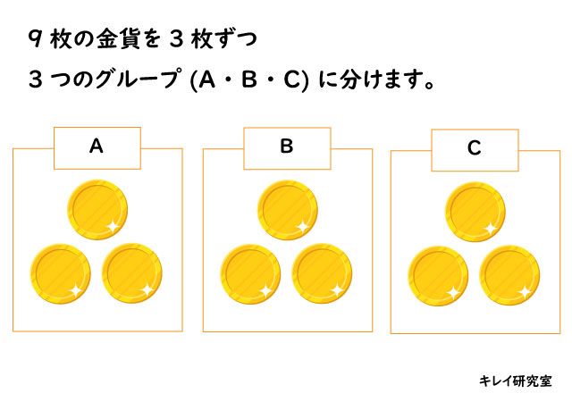 1)まず、9枚の金貨を3枚ずつ3つのグループ(A・B・C)に分けます。