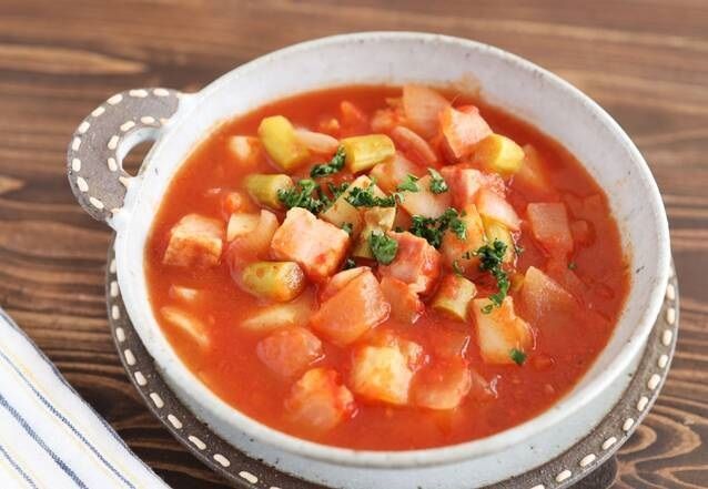 新玉や新ジャガ、グリーンアスパラなど野菜がたっぷり入っているミネストローネです。これ1品だけでも栄養バランスが良いのでおすすめです。野菜の甘みで、子どもも食べやすい味わいに。