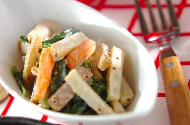 みずみずしくてやわらかい新ゴボウの和え物です。アクも少なく、和え物に使うにはぴったりですよ。マヨネーズや練ゴマなどの「合わせダレ」は子どもも好きな味わいなので、覚えておくと便利。