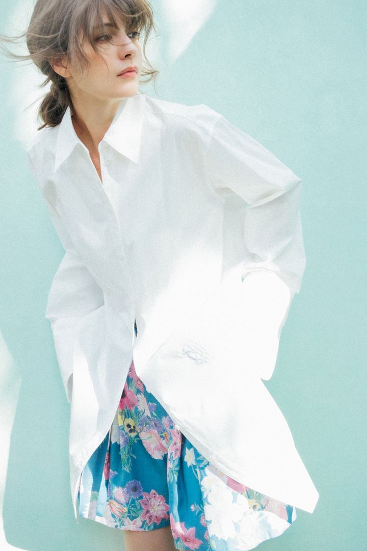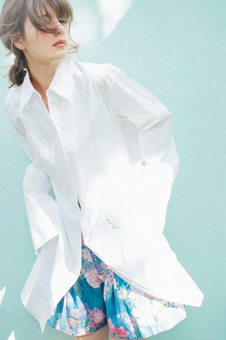 シャリッとしたモダンなシャツドレスに、アイコニックでカラフルな花柄のショートパンツを合わせて。すらりと伸びる美しい脚がアクセサリー。シャツドレス¥59,400、ショートパンツ¥59,400(共にケイタマルヤマ)