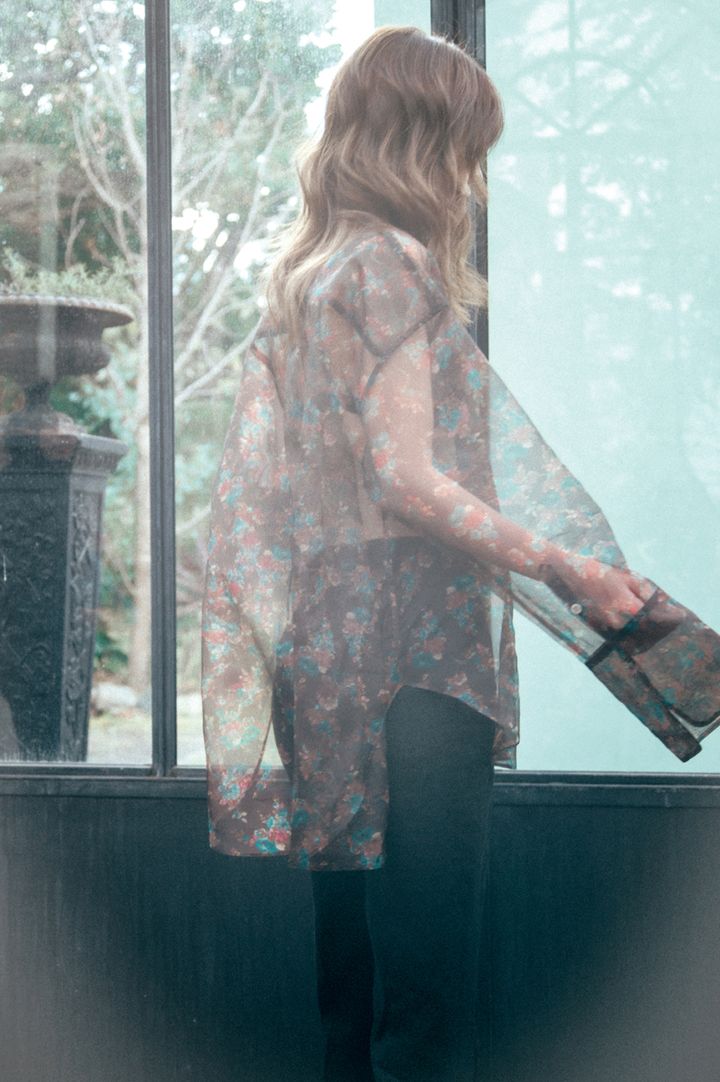花々のプリントがフェミニンなオーガンジーのシャツは、ロングカフのオーバーなサイズ感とのケミストリーを楽しんで。シャツ¥69,300、リネンパンツ¥99,000(共にケイタマルヤマ)、インナー、シューズはスタイリスト私物