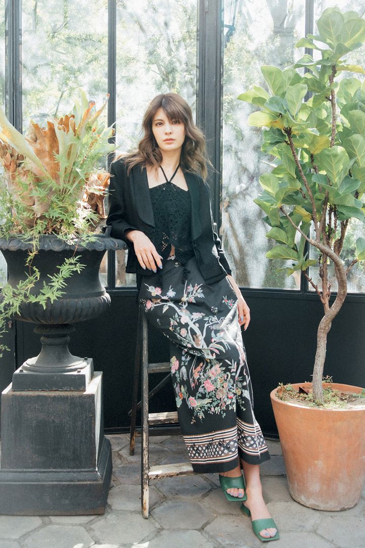 動物や植物をプリントに落とし込んだスカートには、大麻布(ヘンプ)の肌触りを再現した、シルクのように滑らかでコットンのように柔らかな「majotae」という素材のジャケットがお似合い。ジャケット¥132,000、中に着たニットトップス¥59,400、プリントスカート¥79,200(全てケイタマルヤマ)、シューズはスタイリスト私物