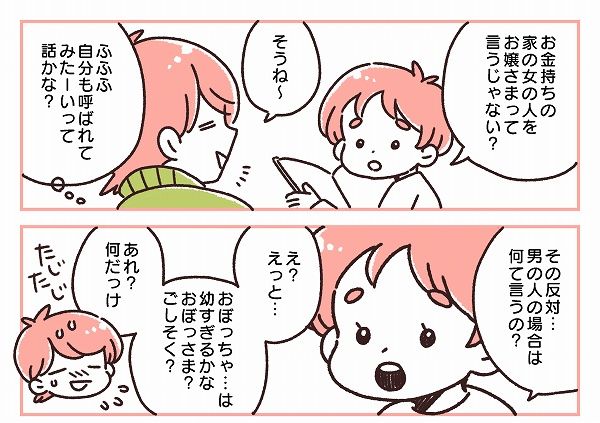 何を読んで知ったのかはわかりませんが、お嬢さまという単語を認識した娘。「では男の人の場合はなんというの? 」と興味を持ちました。しかし、候補は出てくるものの、「お嬢さま」の反対語としてピッタリと来るものがイメージできません。即答できないことに、いかに自分がぼんやりと生きているのかと苦笑しました。