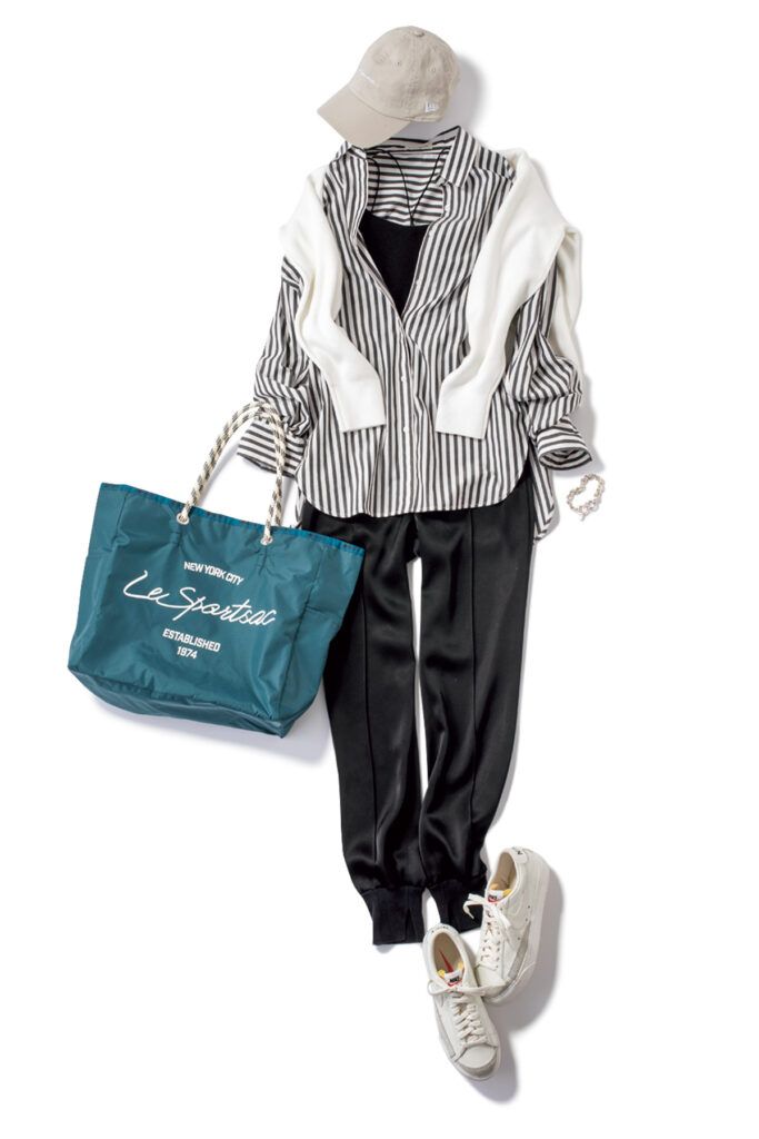 ストライプシャツにニットの肩がけで軽やかに!3月の春カジュアルコーデ【着回しDiary】