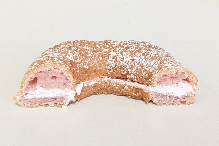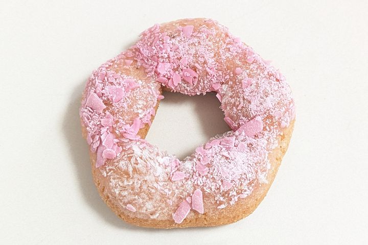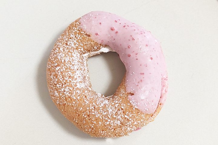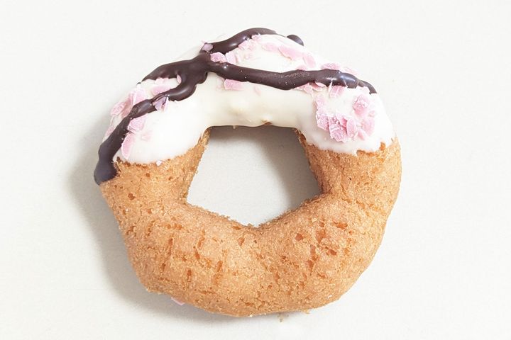 ぱっと見は桜風味のフレークチョコとキラキラトッピングがまぶされているように見えるのですが、実はドーナツに桜葉入りの桜あんがコーティングされています! 食べると、この桜あんがすごくいいアクセントになっているんです。また、ふたつのトッピングの食感がサクサクしていてすごく楽しい気持ちになります。サクラサクでこれから試験を受けるかたや合否待ちのかたへのゲン担ぎにもよさそうなドーナツです。
