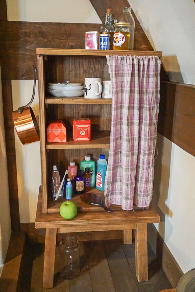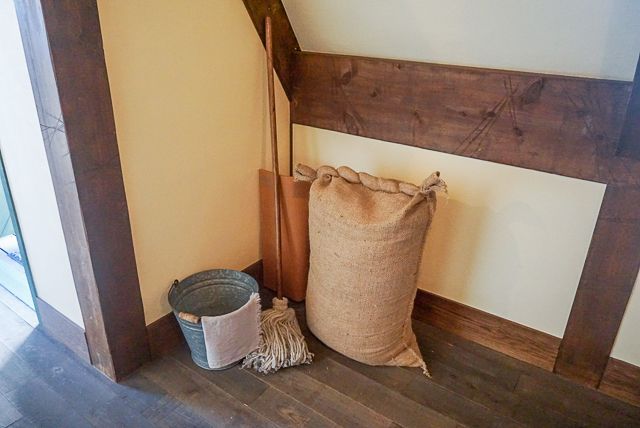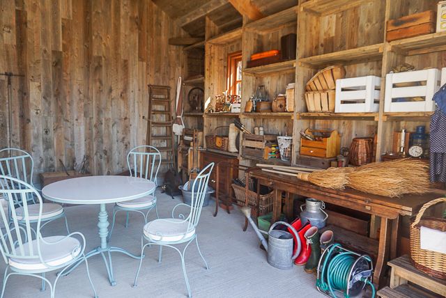 家の隣の「車庫」には数種類のほうきを発見! さすが、空飛ぶ魔女の家ですね。