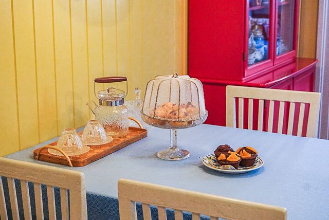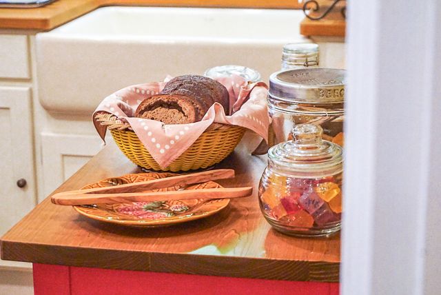キッチンは、それぞれの家庭の暮らしのカラーが濃く表れる場所ではないでしょうか。オキノ邸にはおいしそうなパンやデザートなどがたくさんあったのですね。可愛らしい陶器類にも目がいきます。