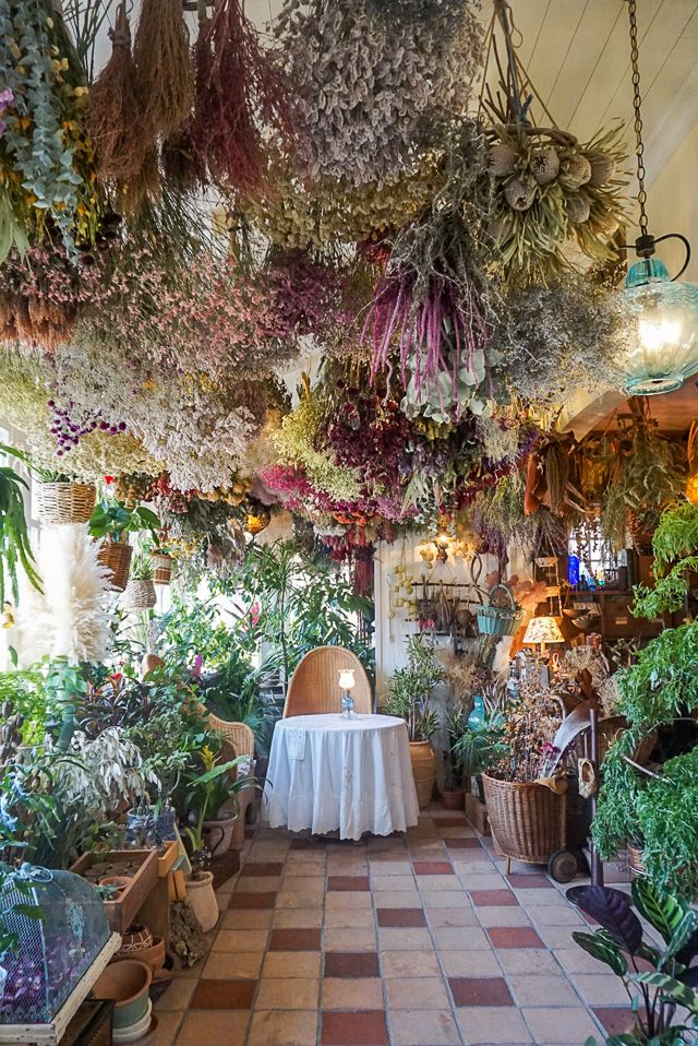 たくさんのドライフラワーが天井から吊るされ、緑いっぱいの部屋。実際に外から光が入ってくるので、明るくて気持ちのよい空間です。