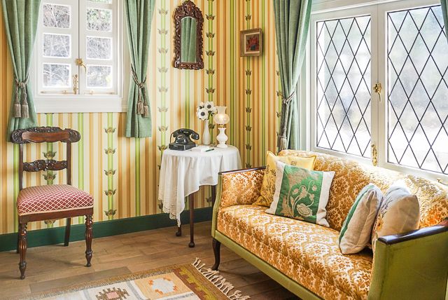 続いてリビングルーム。オキノ邸のインテリアは部屋ごとにテーマカラーが異なり、壁紙や家具の色遣いがおしゃれです。