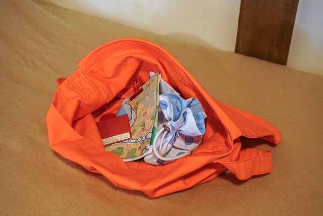 中には何が入っているのでしょう。地図、ノート、水玉のポーチ。映画と見比べてみると楽しいです。