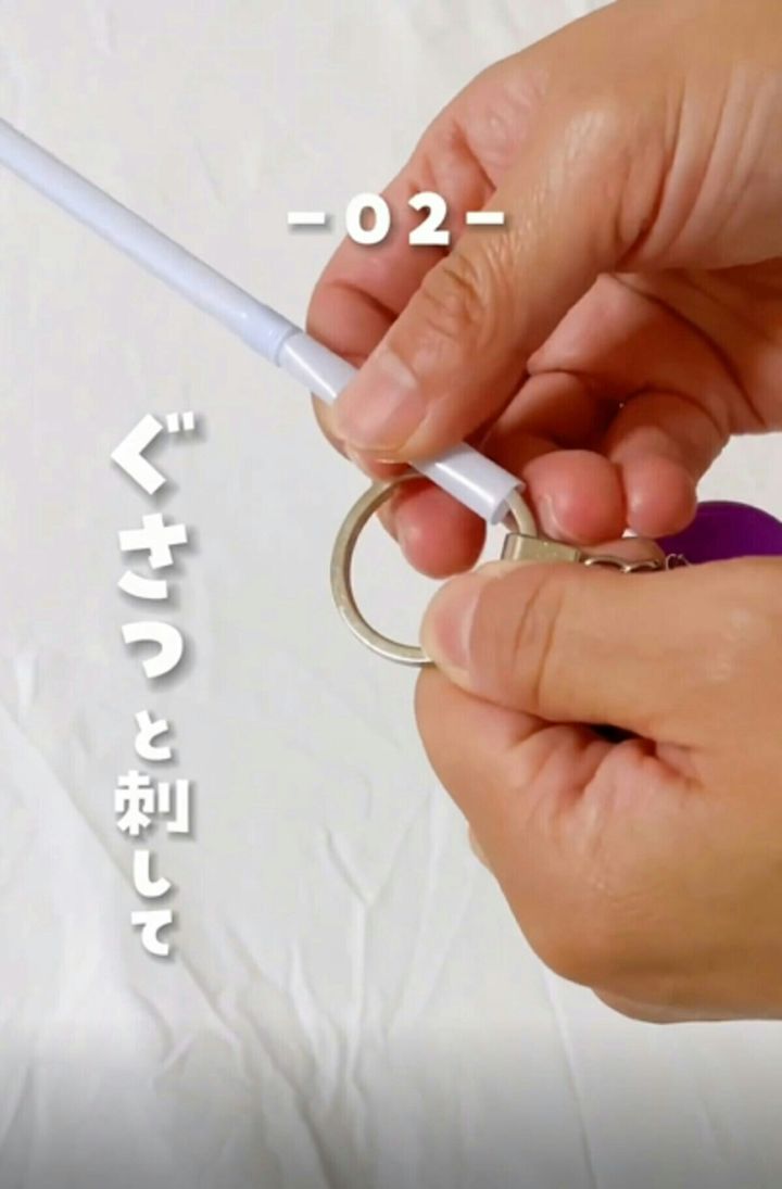 子どもの持ち物の目印などに便利な「キーホルダー」。一方、さまざまなタイプのものがあり、中には取り付けにくいものもありますよね。そんなキーホルダーも、しーばママ|ライフハックに沼った主婦(@shi_bamama)さんの裏技を使えば楽に付けられるとのこと。早速見てみましょう。