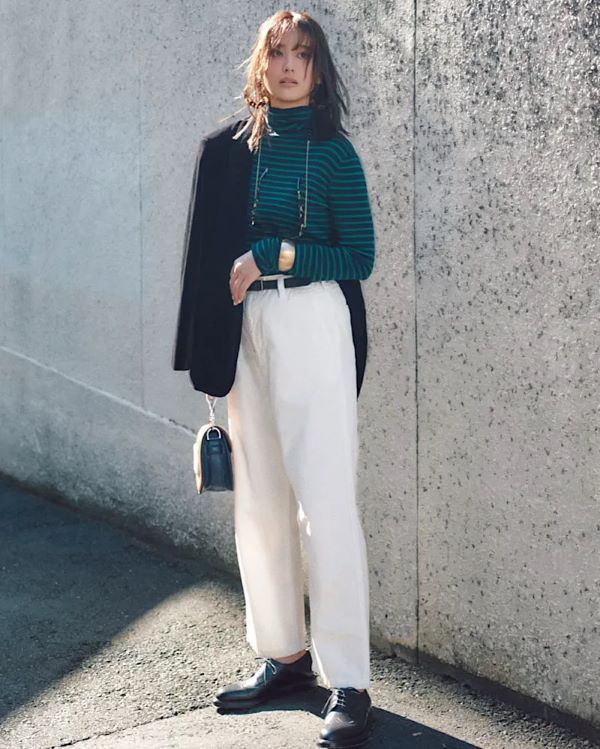 ラフなボーダートップスはタイトなシルエットをチョイスして、さりげなく女性らしさを強調。爽やかな白パンツを合わせることで、洗練された明るいムードが備わります。ジャケットやローファーなどのアイテムで、ちょっぴりハンサムなスパイスを加えるのが今っぽく見えるコツ。