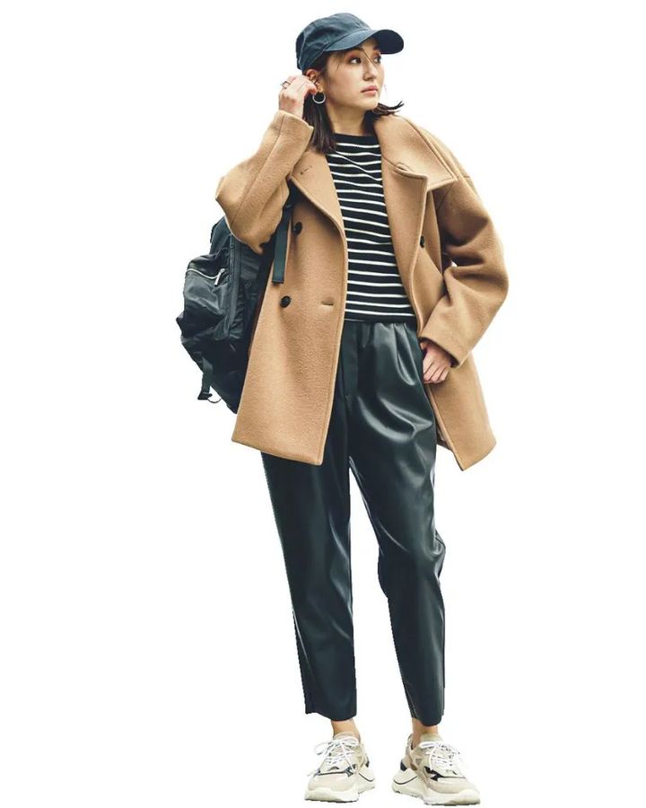 黒ベースのボーダートップスには、色を合わせたレザーパンツを合わせて統一感を意識。女性らしい雰囲気が出るキャラメル色のコートを合わせれば、ラフな装いに大人の甘さが加わります。足元は、ほどよく抜け感の出るニュアンスカラーのスニーカーが◎。