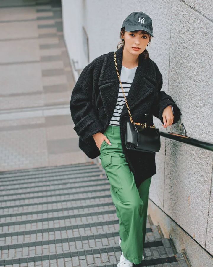重く見えがちな冬の黒コートも、白のボーダートップス×カラーパンツで軽やかさを演出。アクセサリー感覚で使えるチェーンバッグを肩がけすれば、カジュアルスタイルに華やかさが備わります。仕上げにパンツと同色のキャップを投入して、こなれ感をプラス。