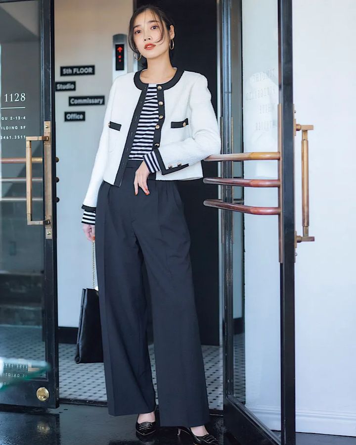 ボーダートップス×黒パンツの定番スタイルも、女性らしいアイテムとの組み合わせで一気に今どきな印象に。アウターにはクラシカルなバイカラージャケットを羽織り、足元はほどよく肌見せできるパンプスでレディに味つけ。仕上げに揺れ感のあるピアスを投入すれば、気取らないのにどこかリッチな大人コーデが完成。