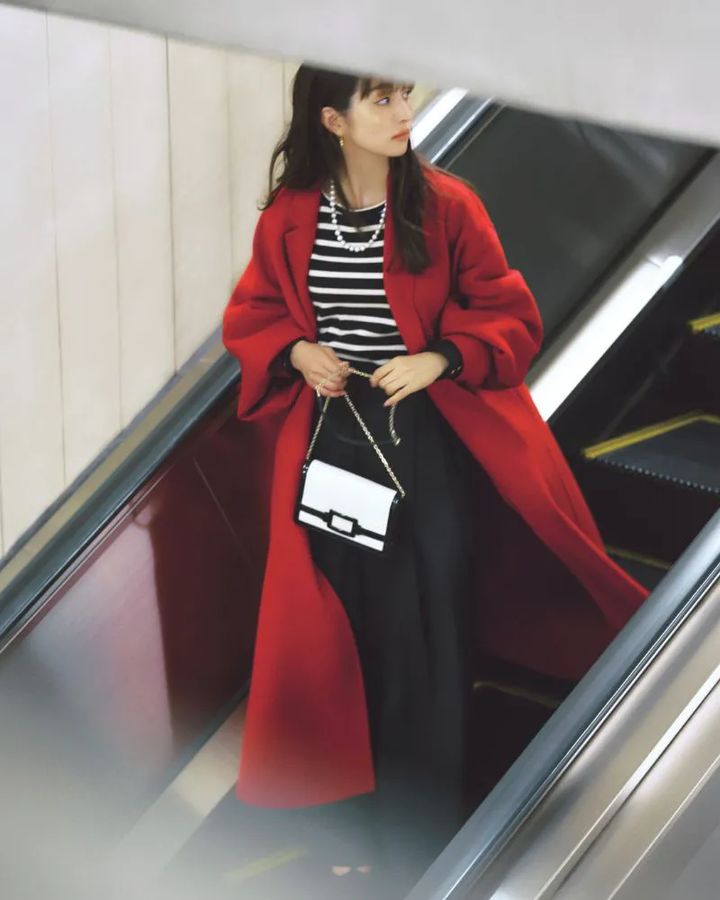 黒のボーダートップスは、ドラマティックな差し色コートの引き立て役としても万能。インナーやバッグをモノトーンで統一して、アウターの存在感を上手に中和して。パールネックレスやチェーンバッグなど女性らしさの香るアイテムを散りばめると、クラシカルなムードに仕上がります。